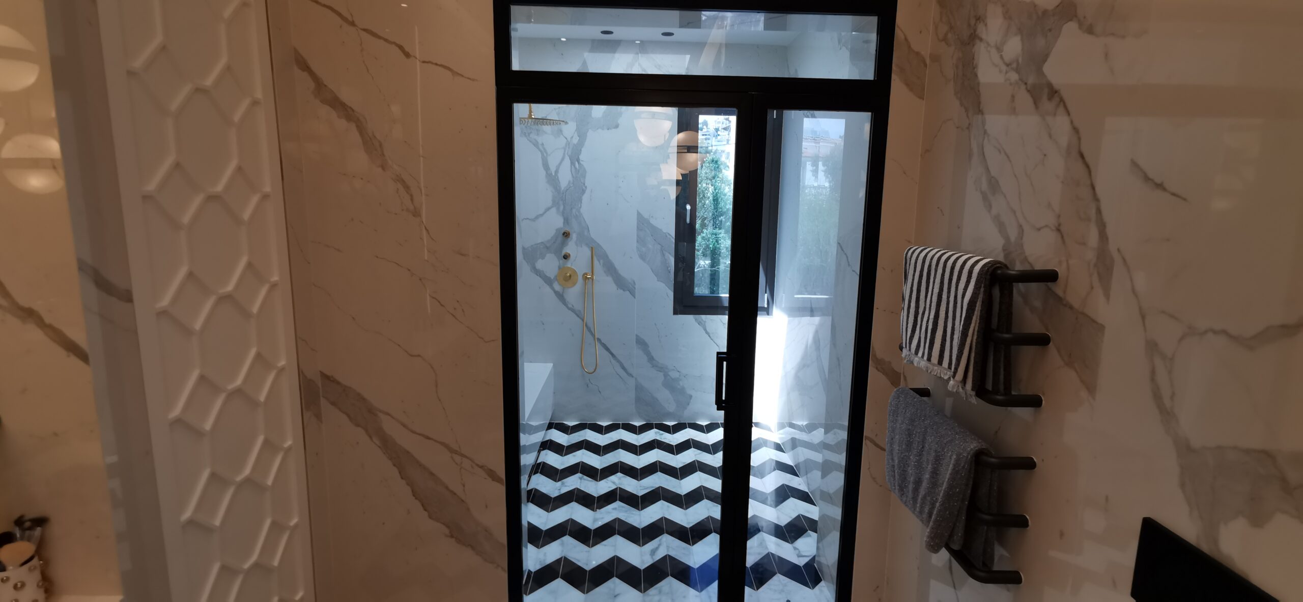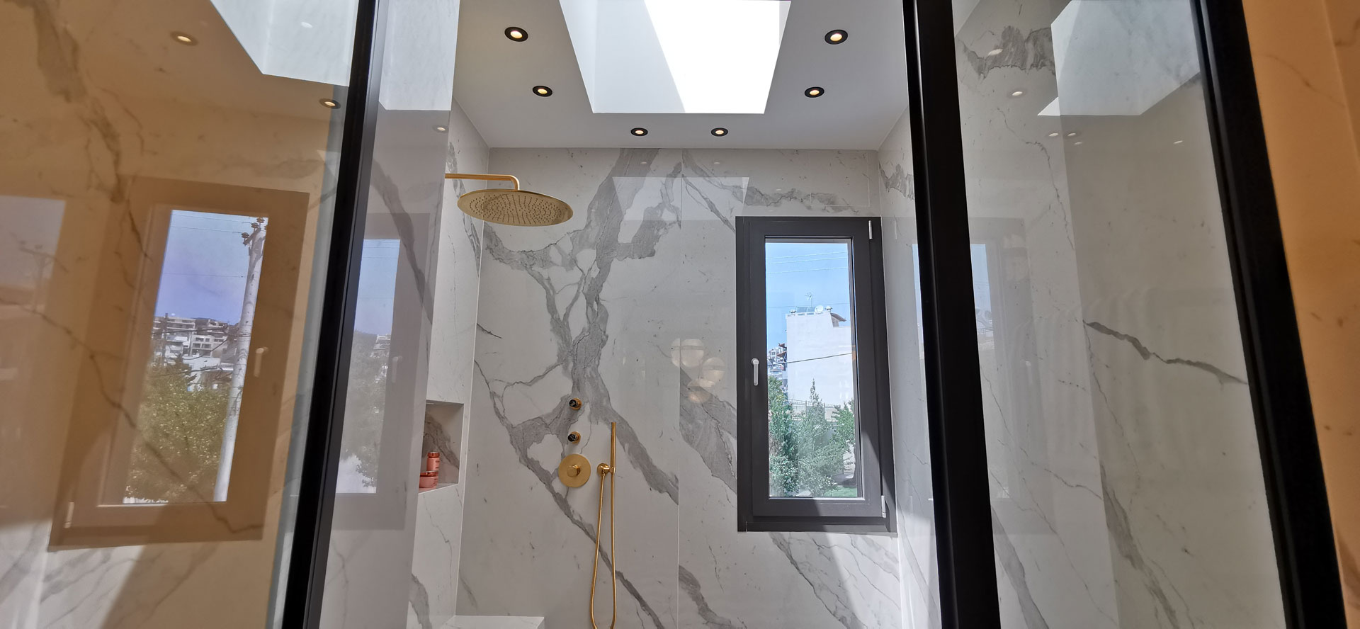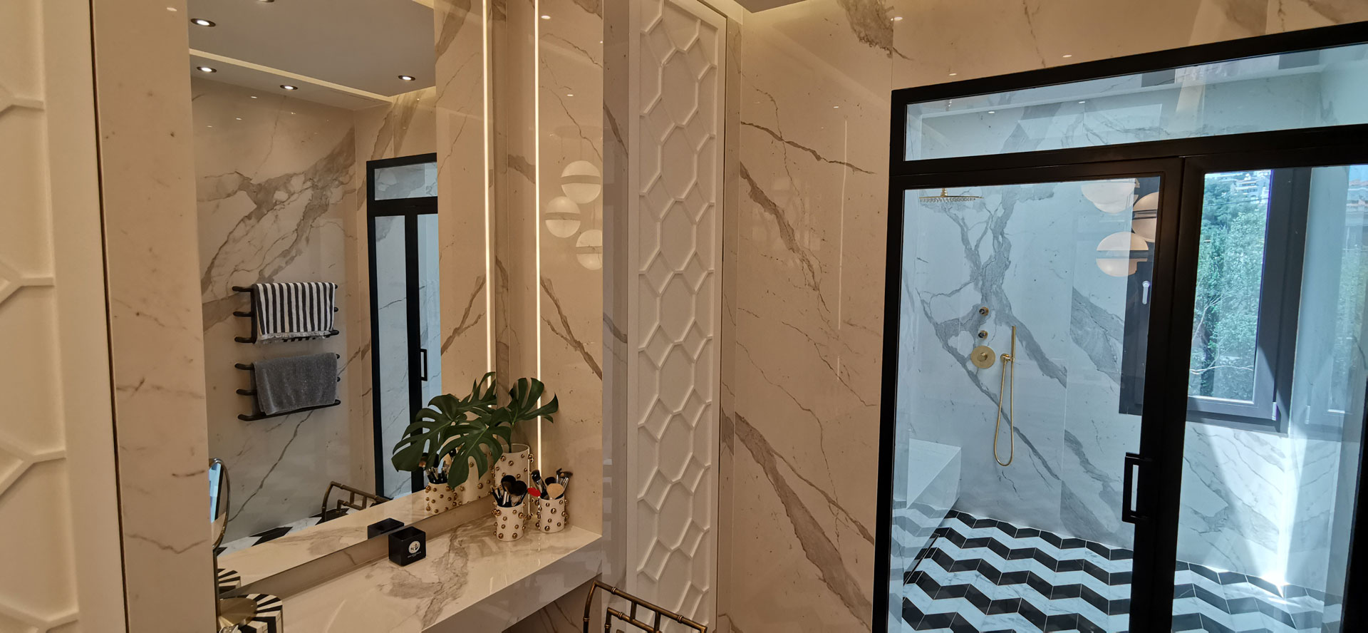 Ανακατασκευη μπανιου κατοικιας στην Βουλα Αττικης. Πληρη μηχανολογικη & αρχιτεκτονικη μετατροπη του χωρου με την δημιουργια custom made επιπλων.
